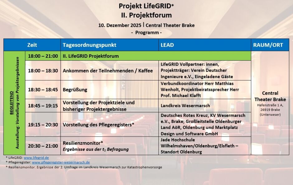 Das II. LifeGRID Projektforum wird im Rahmen des IV. Verbundtreffens am 10. Dezember 2025 in der Zeit zwischen 18:00 und 21:00 Uhr im Central Theater in Brake stattfinden. Zum Projektforum sind, abgesehen von den Verbundpartner: innen und Projektbegünstigten, das Fachpublikum, sowie alle interessierten Bürgerinnen und Bürger in der Wesermarsch und Umgebung eingeladen.