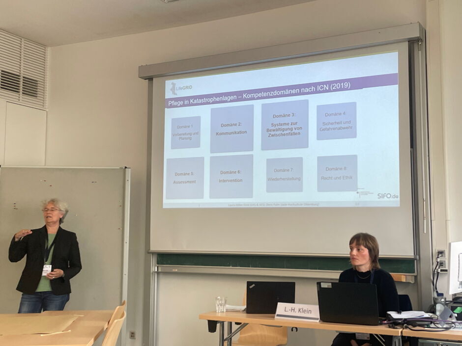 Doris Palm (Jade Hochschule) und Laura-Helen Klein (LVG & AFS) diskutierten die ersten Ergebnisse der Befragung von Leitungspersonen in ambulanten Pflegediensten zu Kompetenzen in der Katastrophenpflege.
