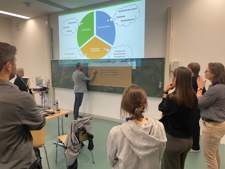 Robin Battenberg (Jade Hochschule) regte zum Austausch über die Befragungsergebnisse der ersten LifeGRID-Befragung an. Die zentrale Frage lautete hier: „Was erhält ältere Menschen in Katastrophen gesund?“.